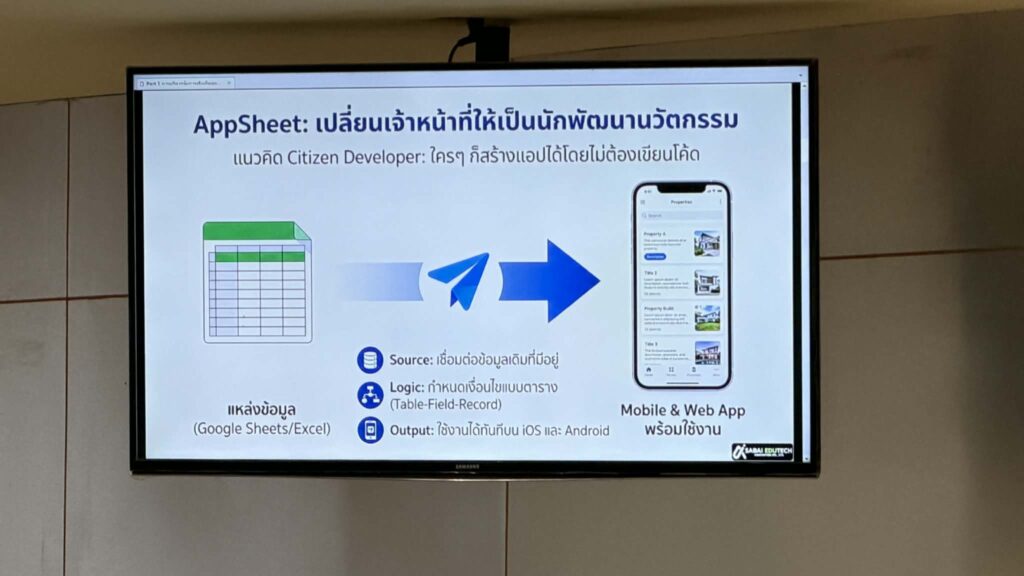 โดยได้รับเกียรติจาก คุณธฤต วรรณเสน ผู้ก่อตั้งและผู้อำนวยการนวัตกรรมดิจิทัล บริษัท สบาย เอ็ดดูเทค อินโนเวชั่น จำกัด มาเป็นวิทยากรถ่ายทอดความรู้และประสบการณ์ เนื้อหาการอบรมครอบคลุมตั้งแต่แนวคิดพื้นฐานการใช้งาน AppSheet ความเชื่อมโยงกับการบริหารจัดการท้องถิ่นและระบบการจัดเก็บรายได้ การพัฒนาแอปพลิเคชันเพื่อสำรวจและจัดการข้อมูลท้องถิ่น การออกแบบแอปพลิเคชันด้วยกระบวนการ Design Thinking ตลอดจนการประยุกต์ใช้ AI ผ่านเครื่องมือต่าง ๆ เช่น Canva AI, Canva Sheet และ Manus