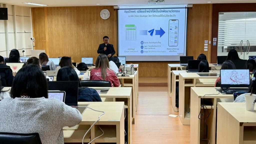 📌 วิทยาลัยการปกครองท้องถิ่น มข. จัดอบรมเชิงปฏิบัติการ “Digital Finance: AppSheet สำหรับองค์กรปกครองส่วนท้องถิ่น” ให้นักศึกษาได้ลงมือพัฒนาแอปพลิเคชันจริง เพื่อยกระดับการเงินการคลังท้องถิ่นด้วยเทคโนโลยีดิจิทัล เมื่อวันพุธที่ 28 มกราคม 2569 ภายใต้รายวิชา CL303505 การประยุกต์ใช้เทคโนโลยีดิจิทัลเพื่อการจัดการการเงินและการคลัง โดยมี ผู้ช่วยศาสตราจารย์ ดร.อุมาวดี เดชธำรงค์ อาจารย์ประจำรายวิชา และ นางดวงฤดี แก้ววิศิษฏ์ กลุ่มงานบริการการศึกษา วิจัย และพัฒนานักศึกษา ทำหน้าที่เป็นผู้ประสานงานโครงการ เพื่อเสริมสร้างความรู้และทักษะด้านเทคโนโลยีดิจิทัลที่จำเป็นต่อการทำงานจริงของนักศึกษาในอนาคต